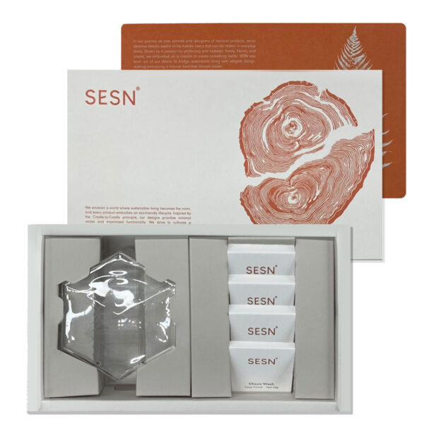永續沐浴餅組內含 2 入(小)或 4 入(大)沐浴餅與一只山線再生玻璃盤,體現自然香氣與循環設計的極致結合。沐浴餅以無水配方製成,具備甜橙與冷杉木香,帶來層次豐富的森林感官體驗;玻璃盤則由 SESN 與春池玻璃合作,以回收玻璃打造出仿山水線條的藝術工物,可作為皂盤或生活配件。整體設計承襲 SESN 國際級設計力,展現產品美學與 ESG 精神的完美平衡。提供企業客製服務,是兼顧環保與質感的送禮首選。